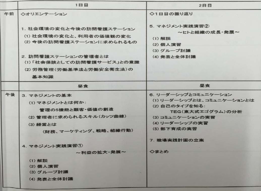 訪問看護管理者育成研修:西村直哉先生の講義では、概論以外の他に、グループディスカッション・発表が多く、管理者が考えている内容や悩みなどをうまく引き出し、話し合う事で、解決案の糸口がみられ、意義深い研修でした。(研修プログラムは別紙参照)